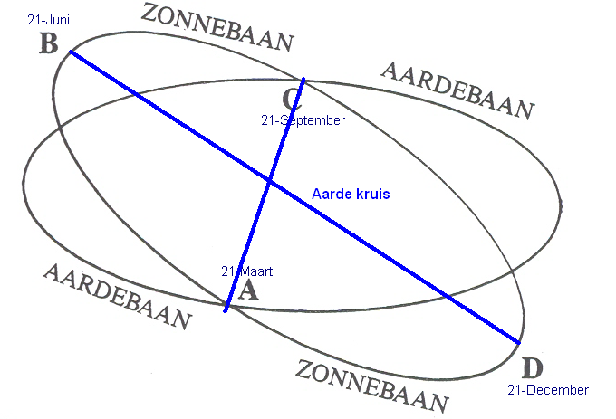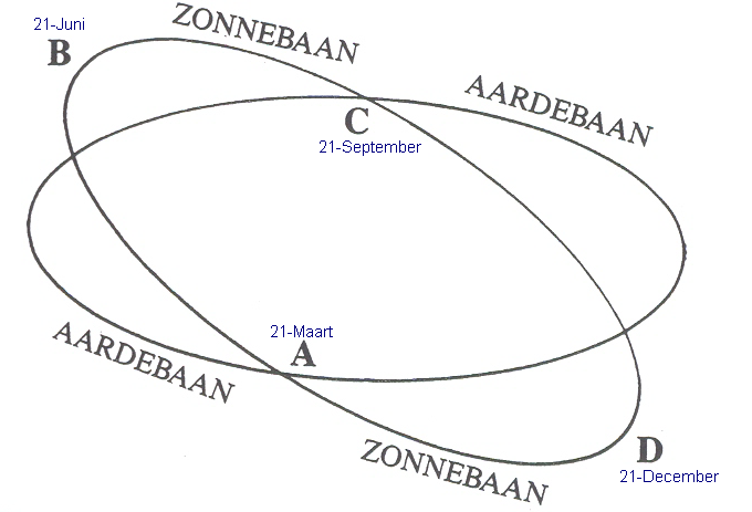 U ziet bij punt A en C weer die punten waar de zonnebaan de aarde baan snijdt, dat zijn de equinox punten; equi = gelijk en noctium = nacht, dus ook: punten van een gelijke nacht en dag ; de dag en nacht in de punten A en C zijn gelijk van lengte.