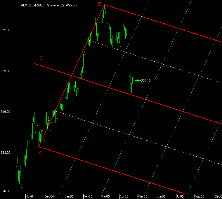 | En dan beeld ik hieronder nog even de AEX grafiek af, waarbij de top C verschoven ligt zoals hier een stukje boven in de tekst is beschreven. | |