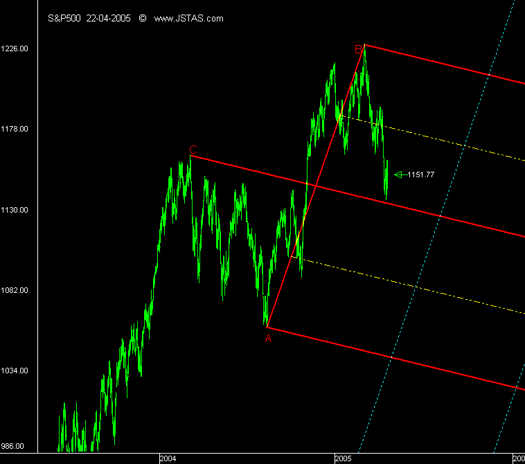 | Alan Andrews had ontdekt dat dit in 80% van de gevallen opgaat, dus in 80% van de gevallen gaat de koers weer terug naar de middellijn. | |