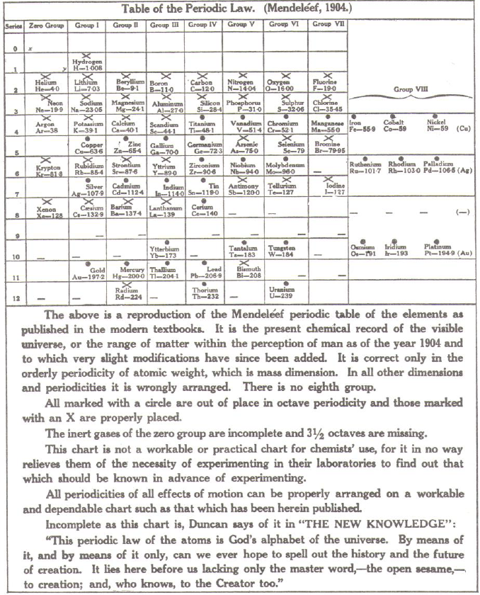Nu ben ik niet voornemens om de opbouw vanuit de octaven naar het periodieke systeem te gaan neerpennen (tenzij daar vraag naar komt); maar het is wel zeer interessant om de tabel van Mendeléef van 1904 en het tien octaven systeem uit die tijd van Walter Russell te bekijken/ bestuderen.