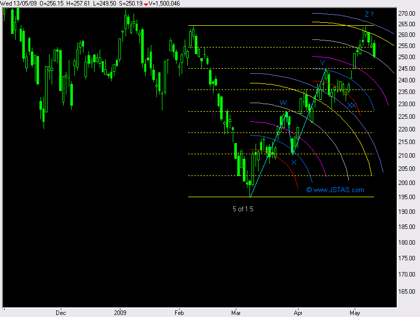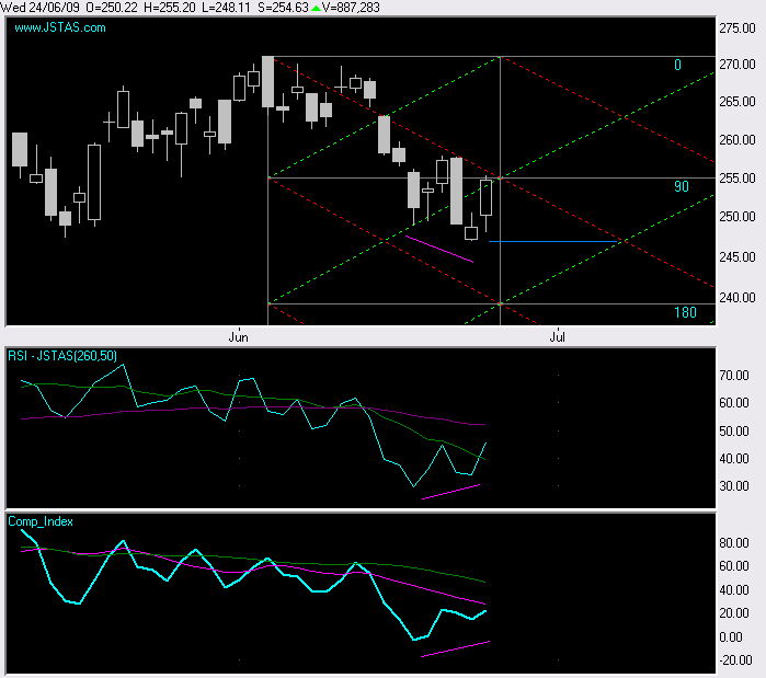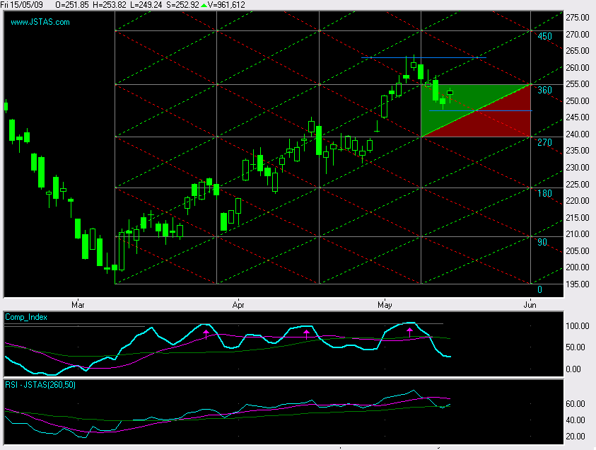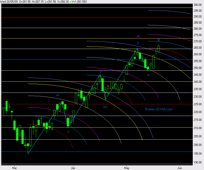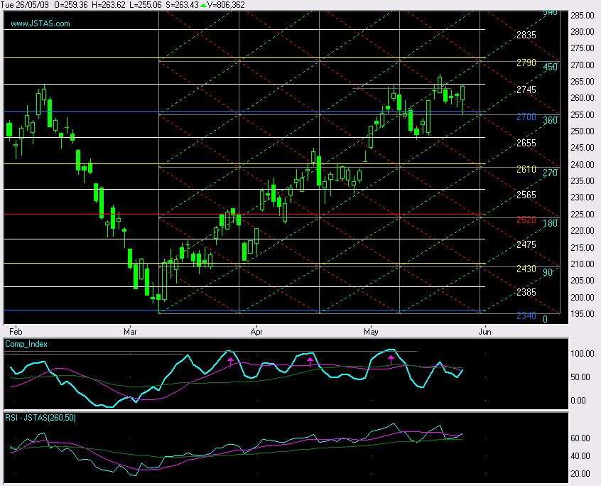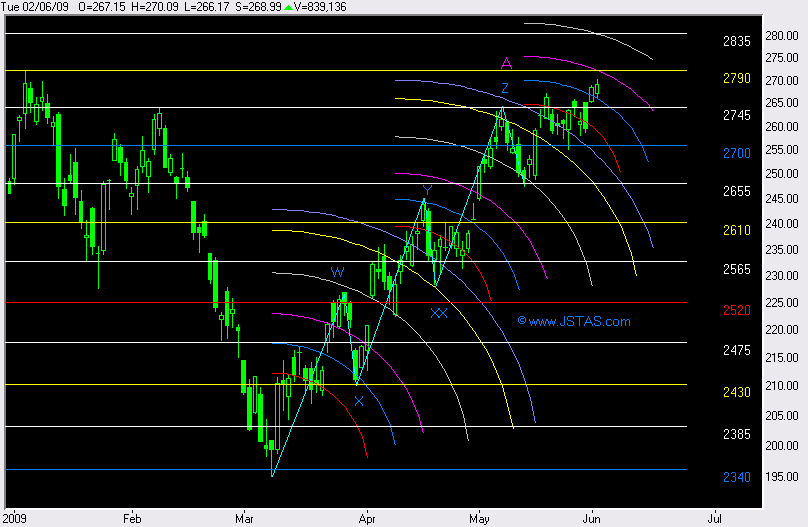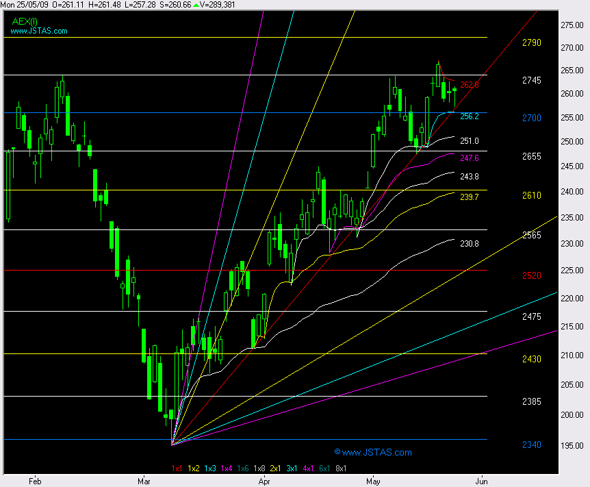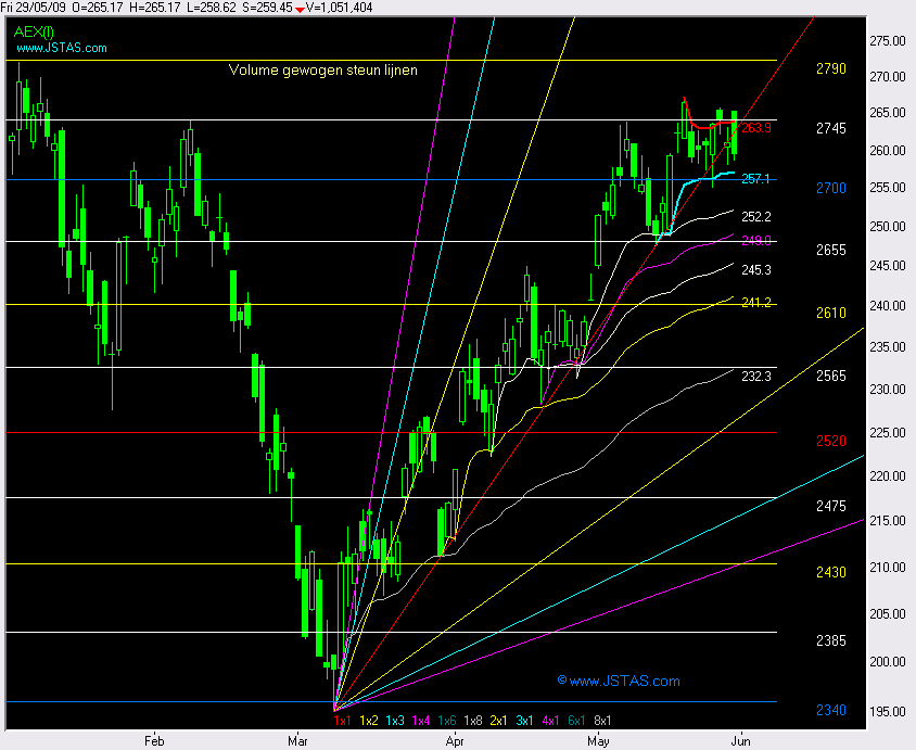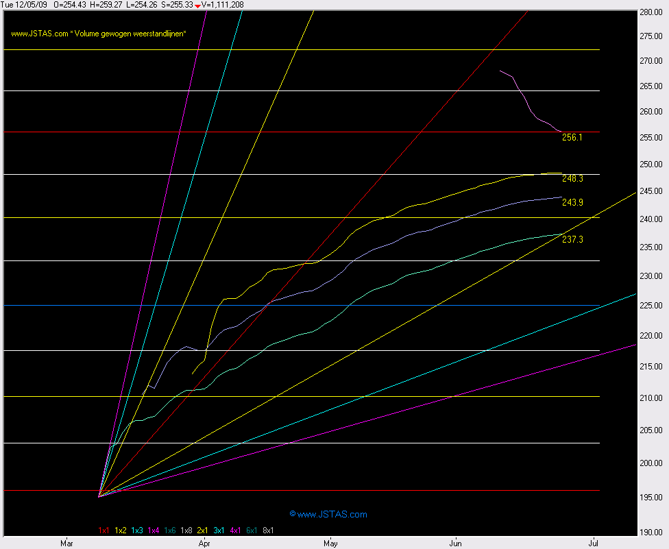 In bovenstaande grafiek zien we dat het de koers niet lukte om boven de weerstand van de Gann lijn op 2745 graden uit te komen ( 263,95 - 264,06)
