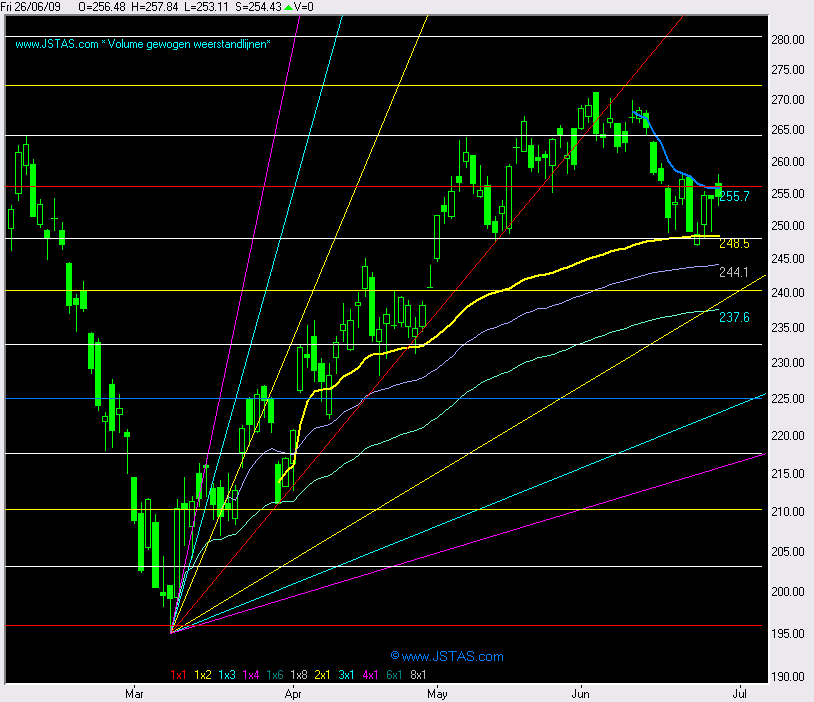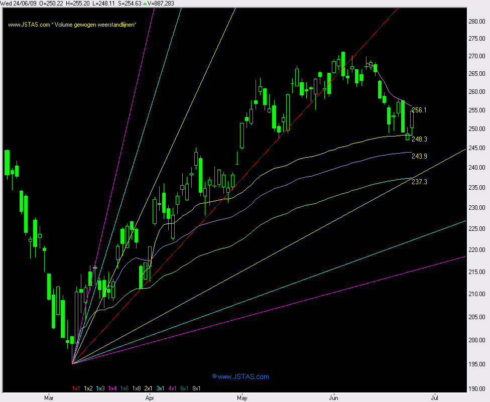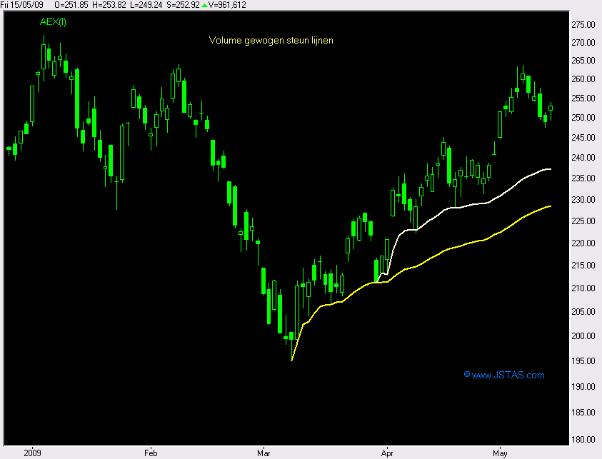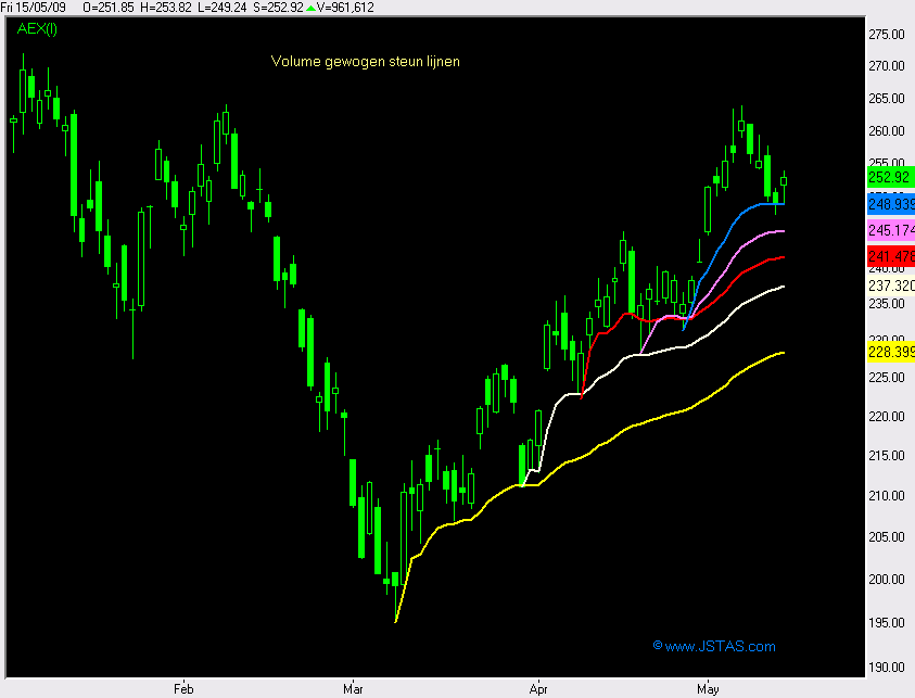 U ziet dat de volume gewogen steunlijn ligt rond de waarde 248,x en weerstand rond de waarde 257,x