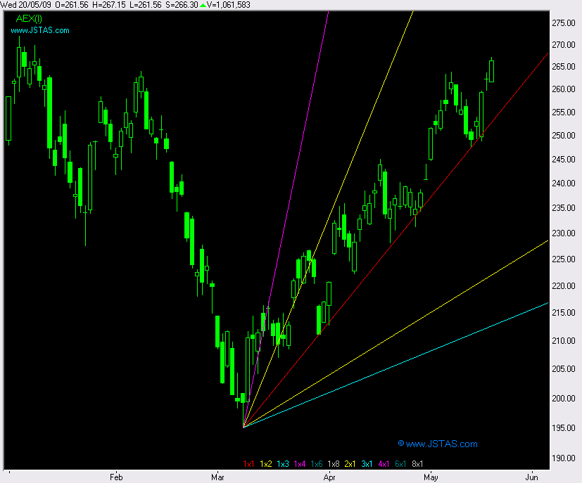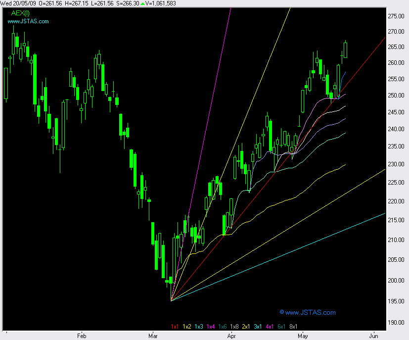 Duidelijk is de doorbraak te zien door de opgaande rode Gann lijn (1X1).