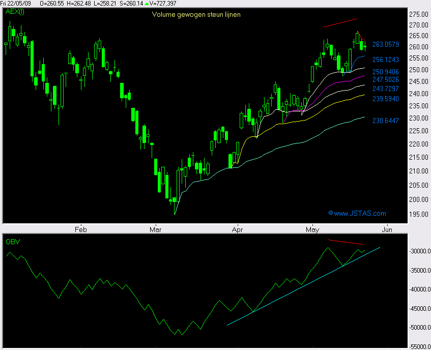 In grafiek 2 ziet u dat de volume gewogen weerstandlijn de afgelopen dagen steun bood aan het koersgeweld, de koers sloot niet onder deze lijn, maar ondervond steun van deze lijn.
