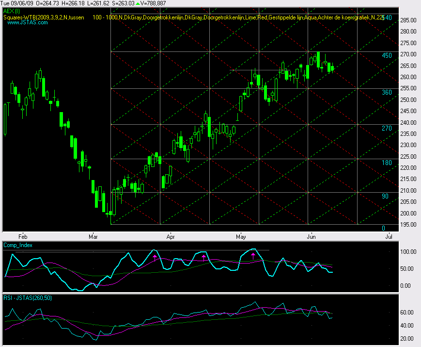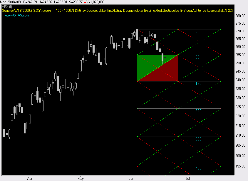 Ook zien we in deze grafiek dat de hoogste koers van drie Juni exact afketste op de 450 graden lijn van dit square.