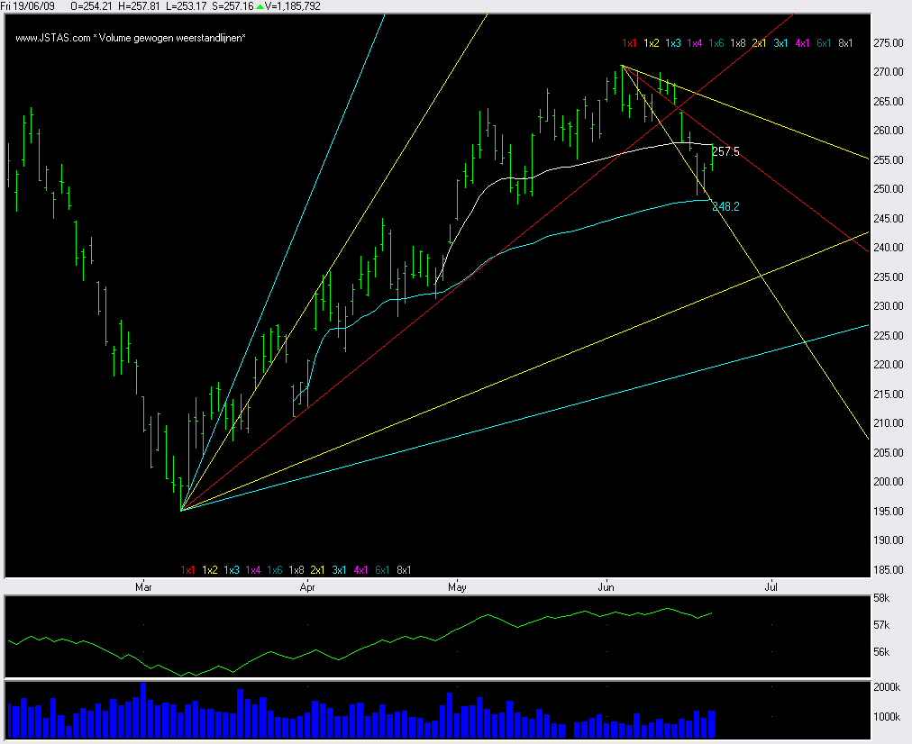De bovenste wiite volume gewogen weerstandlijn komt van de datum 3-Juni, waar een duidelijke omslag plaats vond.