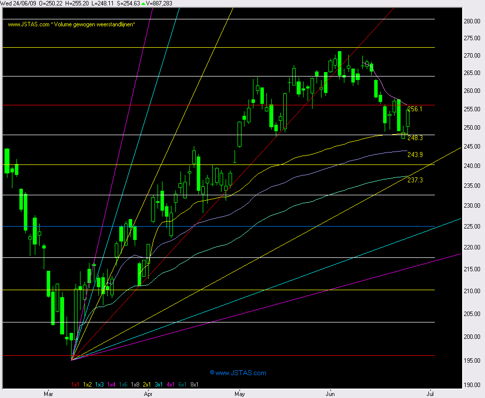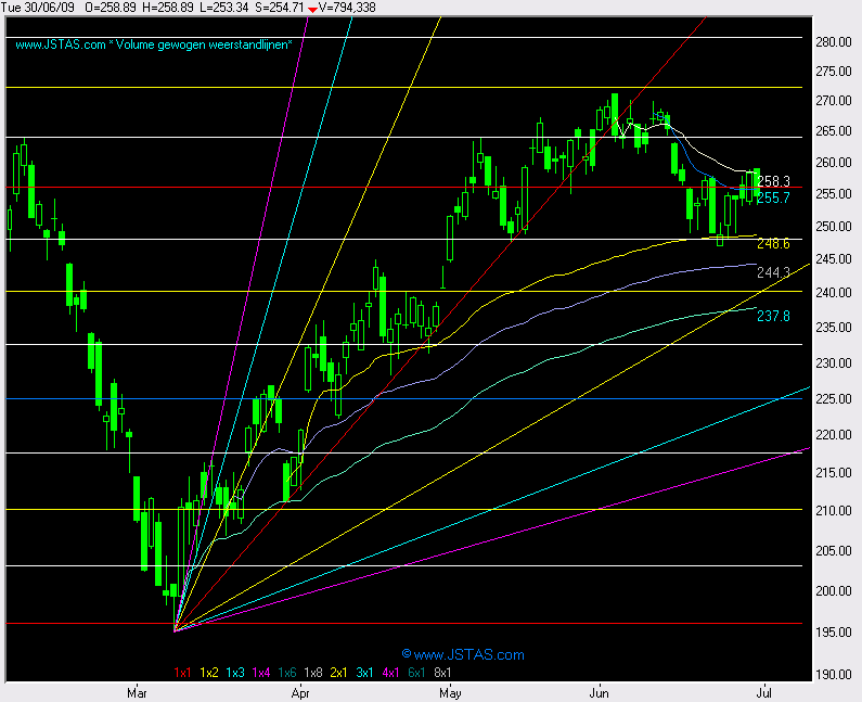 In bovenstaande grafiek is een steun/weerstandlijn gestart op 9-Maart-2009.