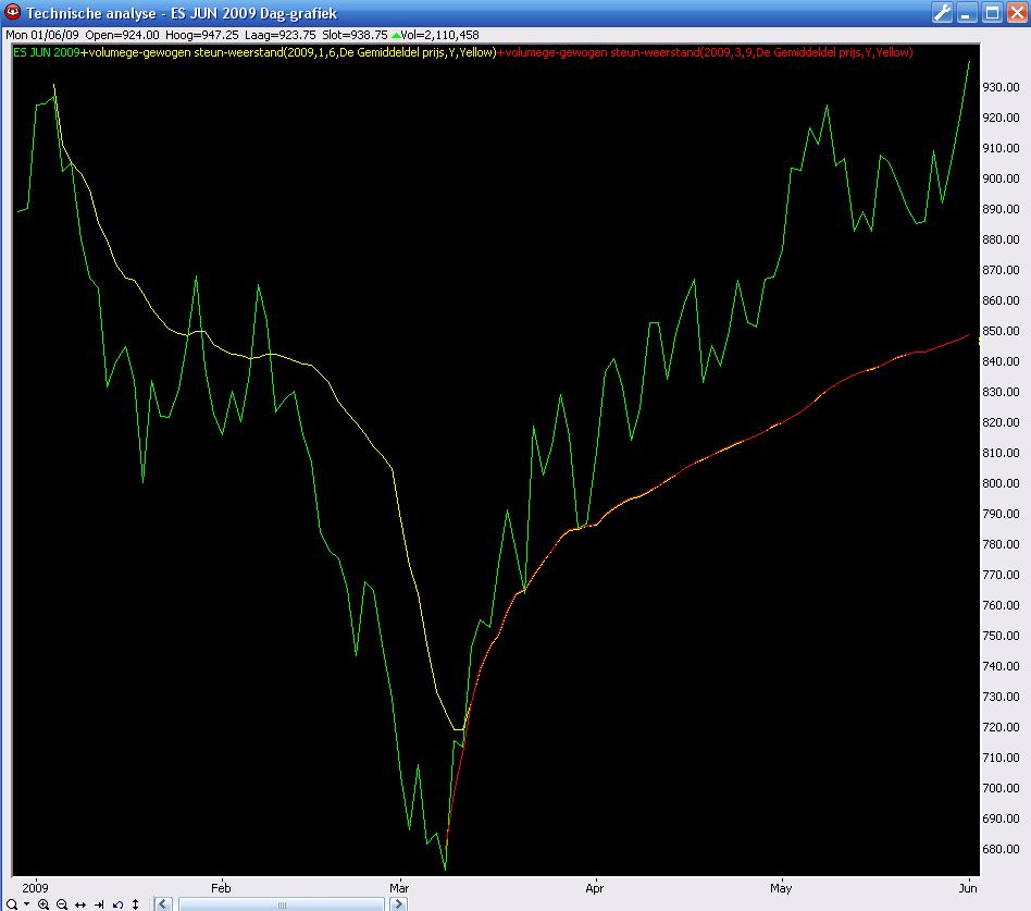 Ik plaats die volume gewogen steunlijnen er even bij in bovenstaande grafiek.