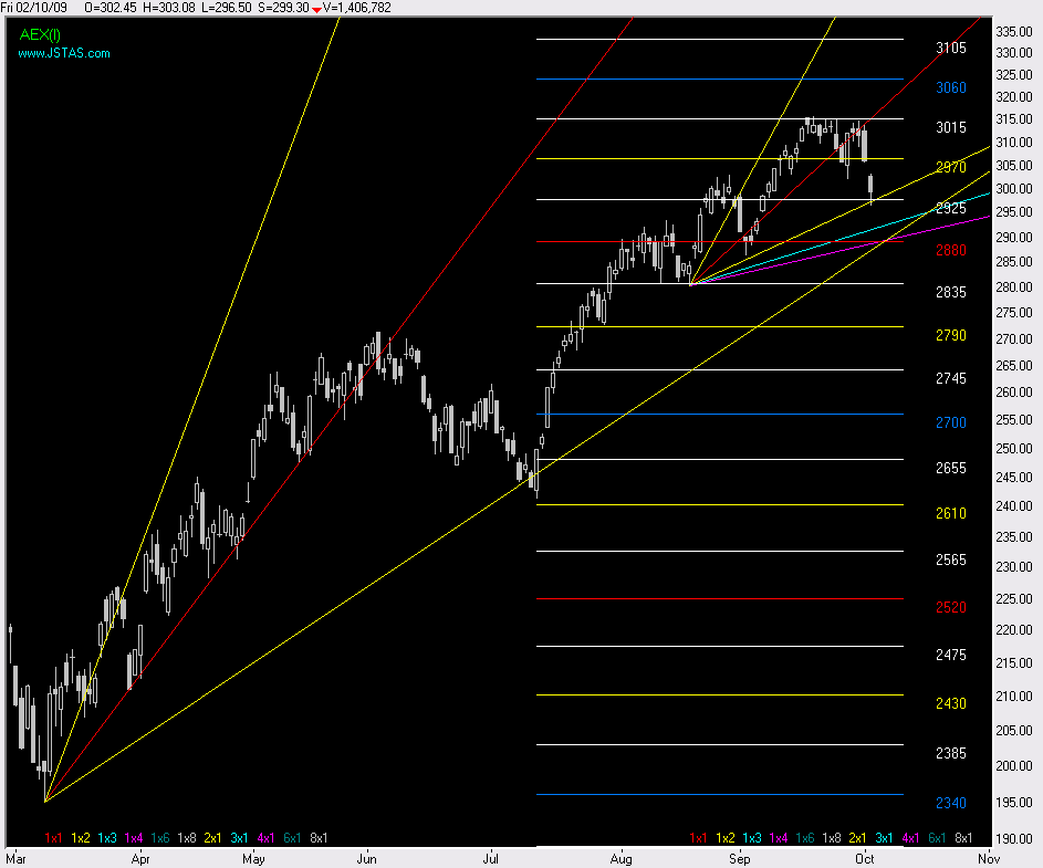 De koers is afgelopen vrijdag bij de daling blijven hangen in het gebied rondom de witte cornercross lijn op 2925 graden en de gele Gann lijn getrokken vanuit 19 Augustus.