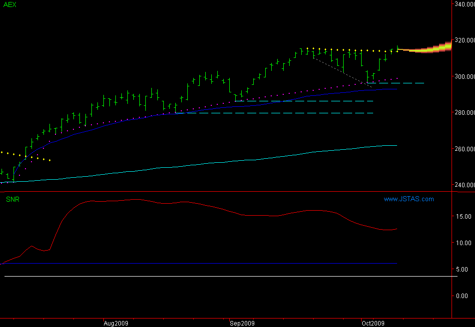 In figuur 9 ziet u de week grafiek van de AEX met een logaritmische schaal verdeling.
