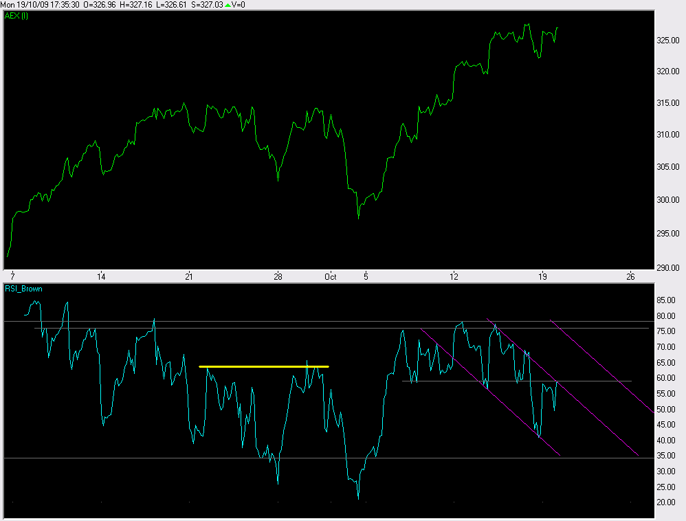 In de RSI grafiek ziet u dat de daling vandaag exact stopte op de kanaal-lijn.