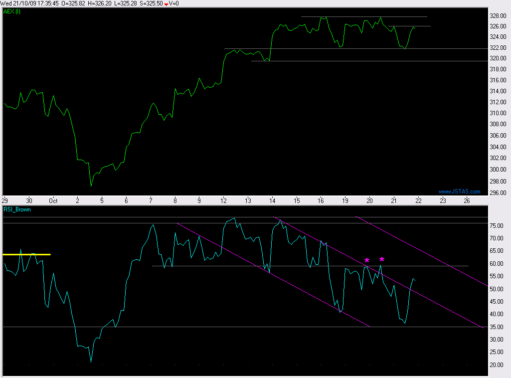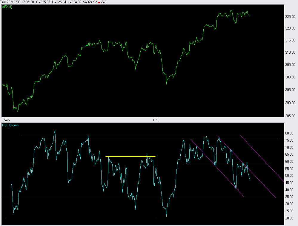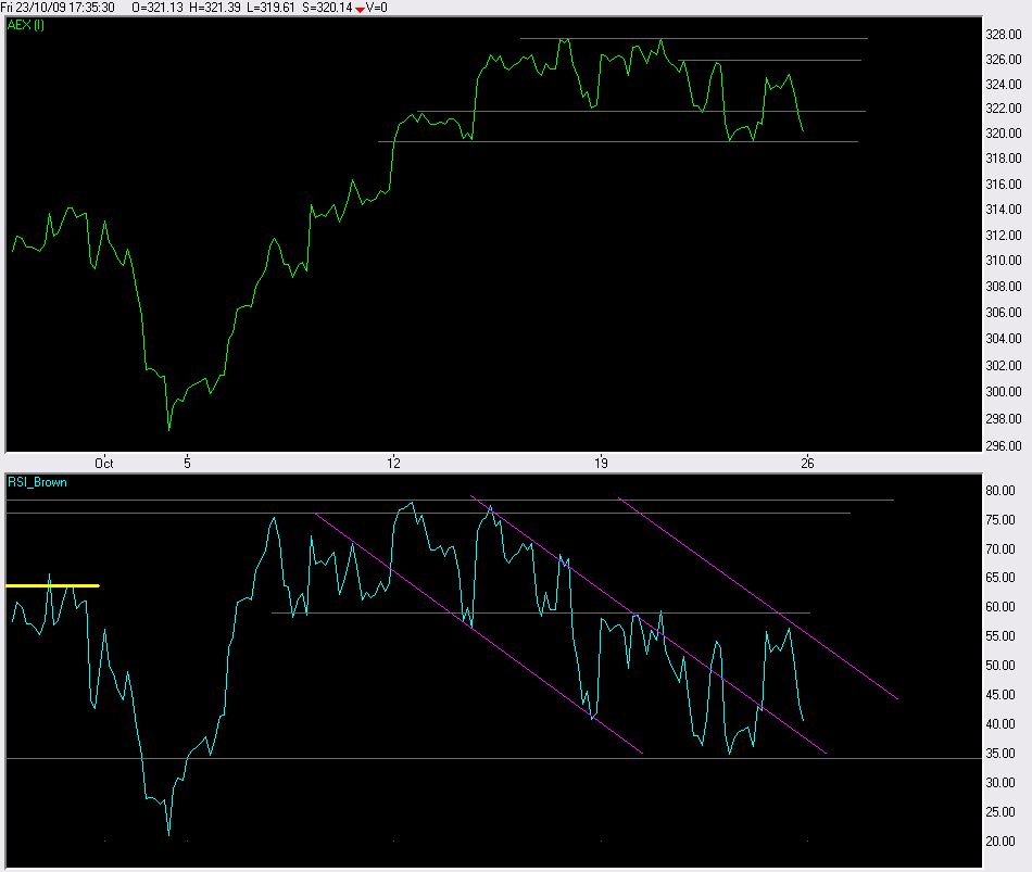 In de 'effe tussendoor' link hierboven ziet u de RSI intraday van de afgelopen dagen, hieronder plaats ik nog even de intraday grafiek op uur basis van afgelopen vrijdag.
