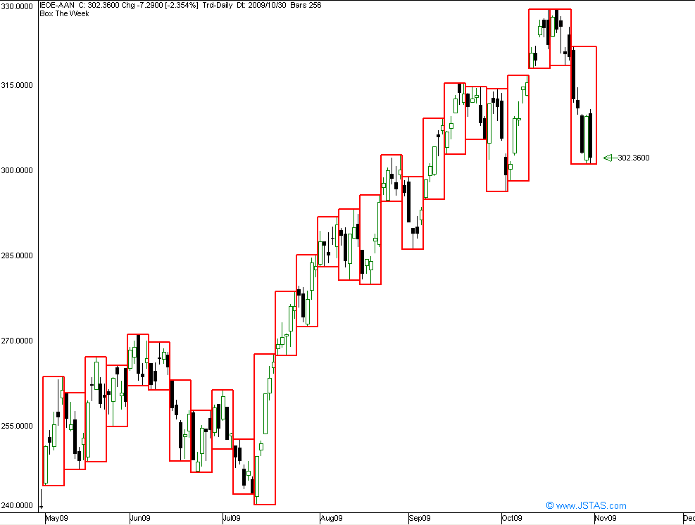 In AEX grafiek -1 staat om elke week een rode rechthoek getekend met daarin de dag candles.