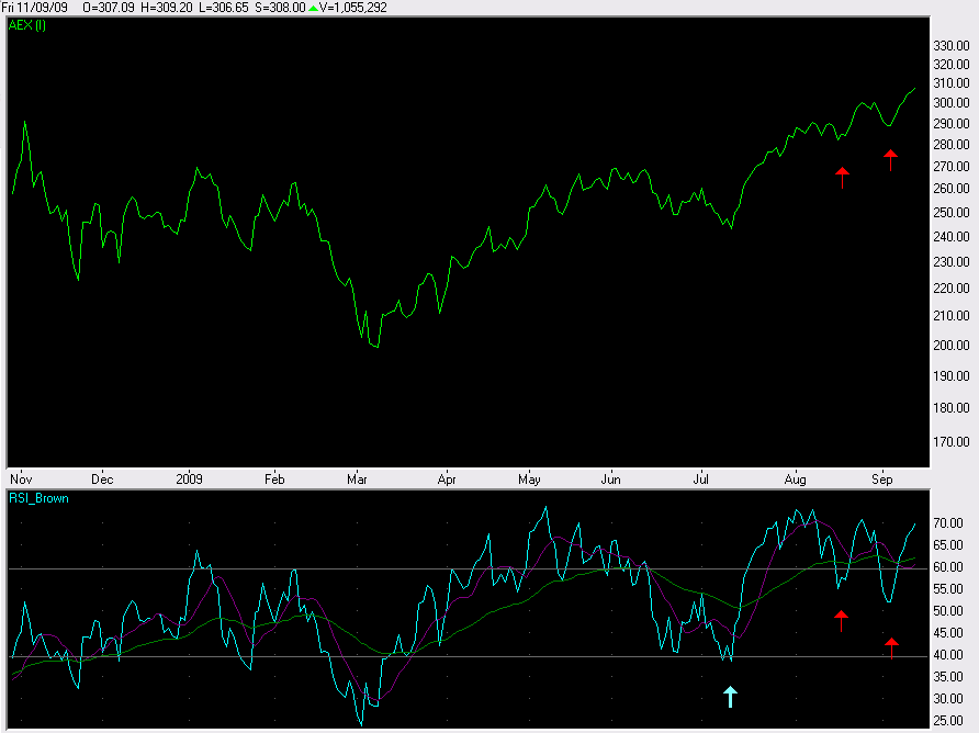 De twee rode pijlen heb ik geplaatst om een moment aan te geven waarop een geringe koersdaling in de koerswaarde van de AEX een overdreven daling liet zien in deRSI-14.