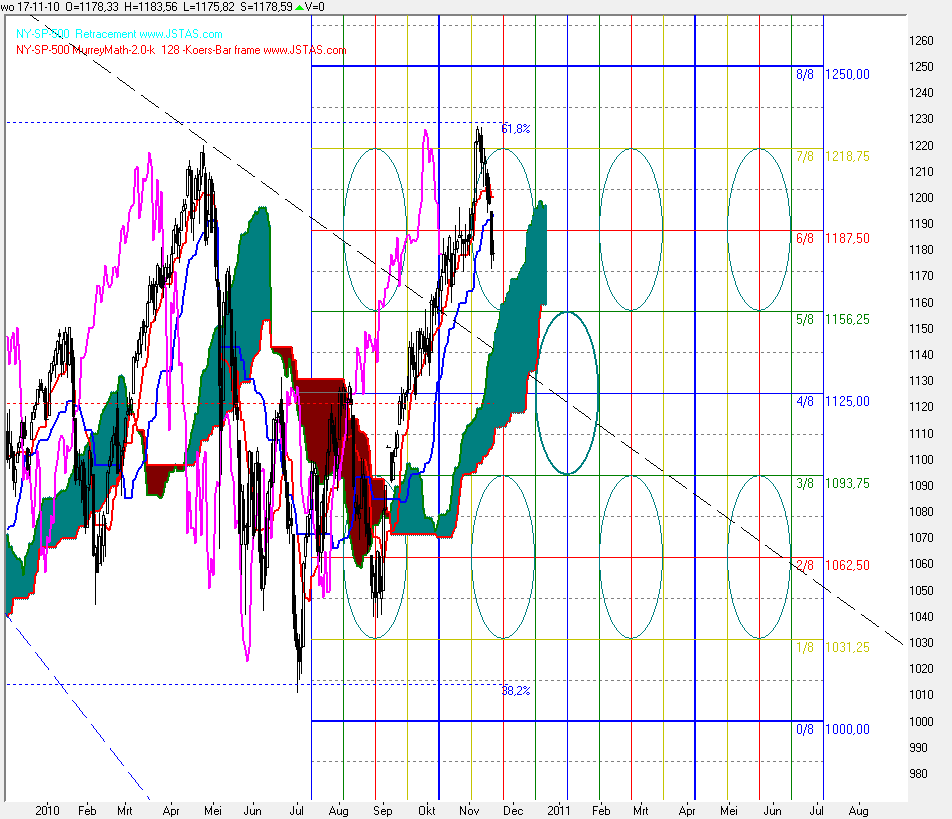 Als door de bliksem getroffen ( kijk dus uit voor dergelijke pivot lijnen ;-)) ) schoot de koers omlaag, de 5/8 lijn werd nu na de twee eerdere aanvallen van vorige week wel doorboord, en steun werd gevonden, wie had het anders verwacht ?, op de 4/8 lijn. | |