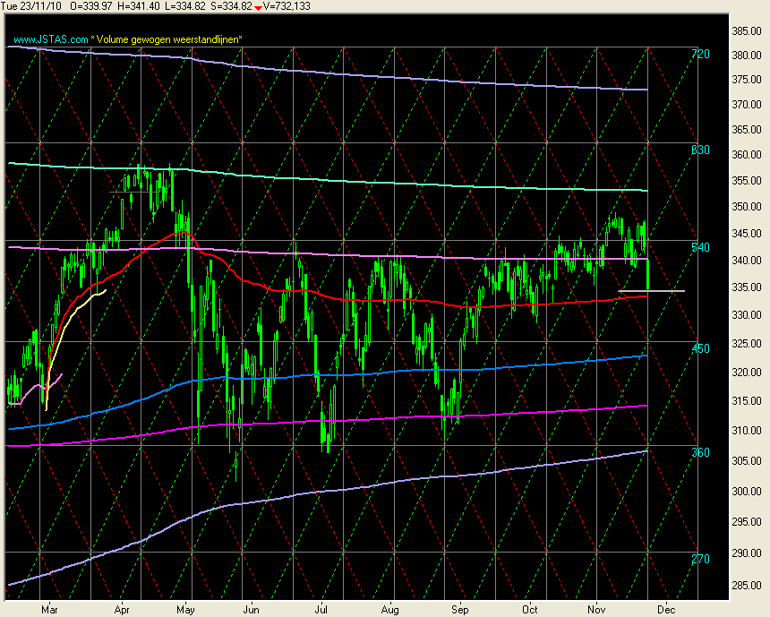 | De koers schijnt maar geen afstand te kunnen nemen van de paarse volume -gewogen -steun -weerstand lijn, de lijn blijft steeds terugkomen als steun of als weerstand gebied. | |