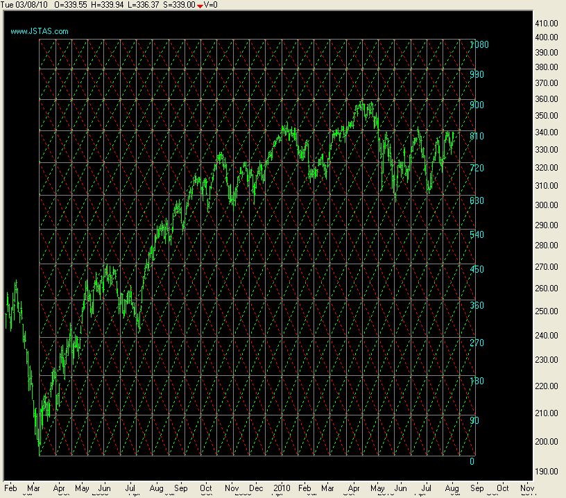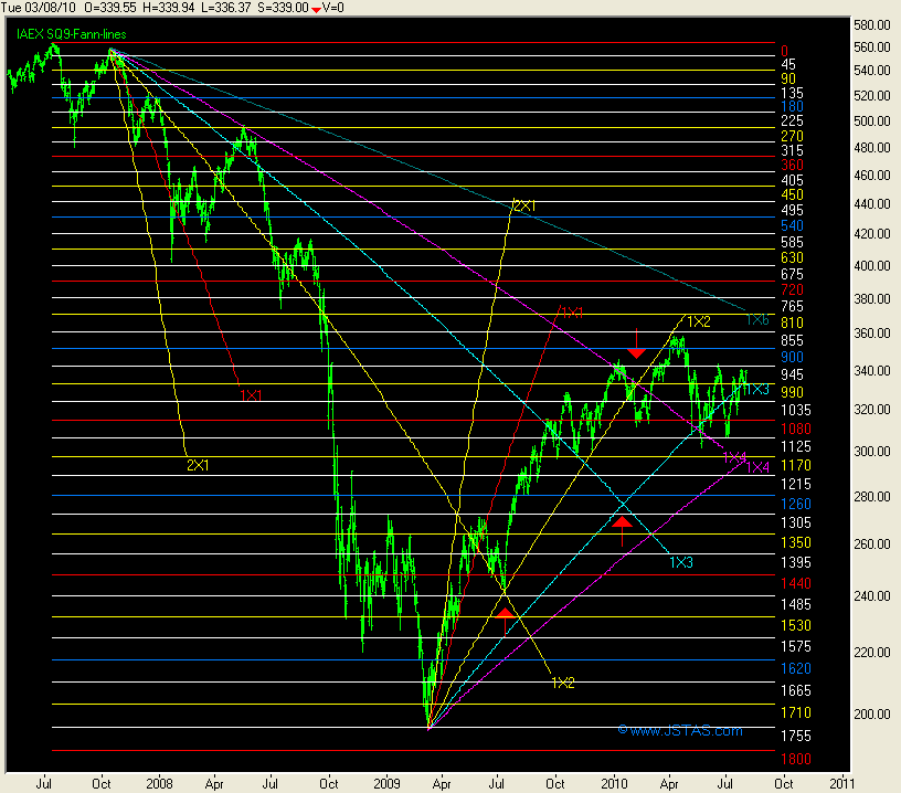In grafiek twee ook een 'oudje', de SQ9 Fannlines die groeien /krimpen volgens het bekende Square of Nine (schuine lijnen) en de horizontale lijnen zijn de lijnen welke uitgezet zijn vanuit de top in Juli-2007 en terug gerekend volgens het SQ9 van Gann.
