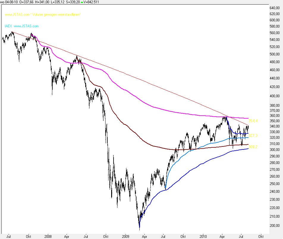 De volume gewogen weerstandlijnen doen ook aardig hun best... in deze grafiek ziet u er slechts een klein aantal, er zijn er veel meer, maar die heeft u zelf wel in uw grafiek staan, ik heb de code ervoor op ta-script.com geplaatst.