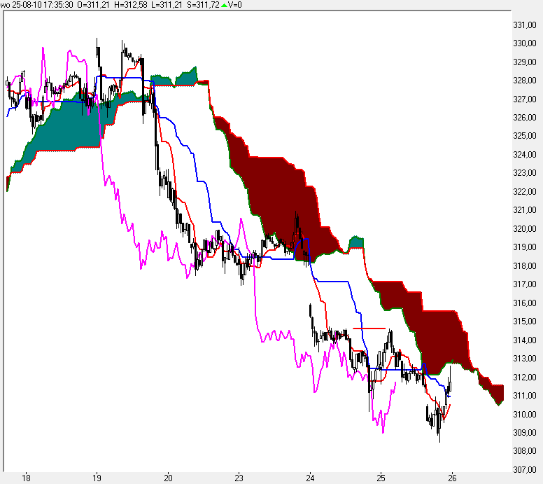 De koers had ruimte om te stijgen naar de onderzijde van de wolk rondom de waarde 316, maar de kracht daartoe ontbrak.