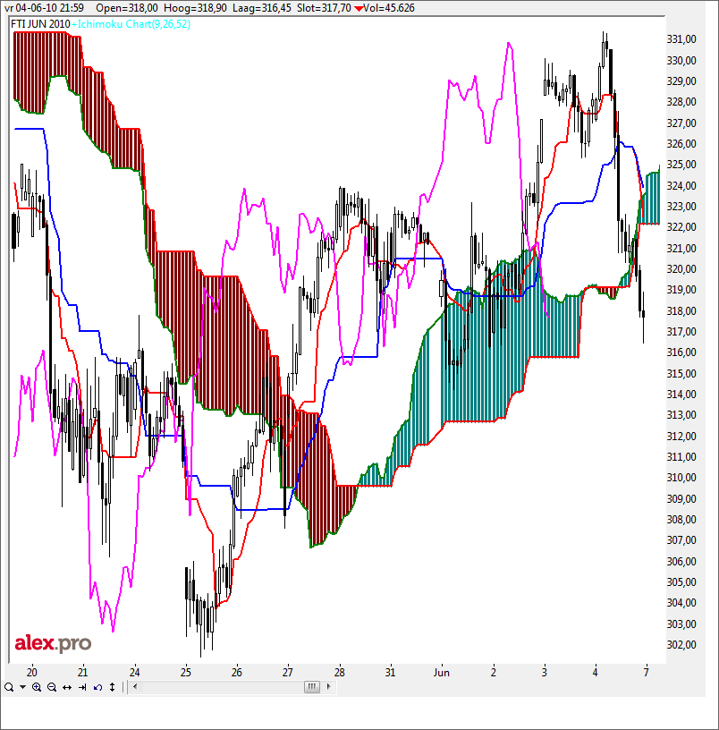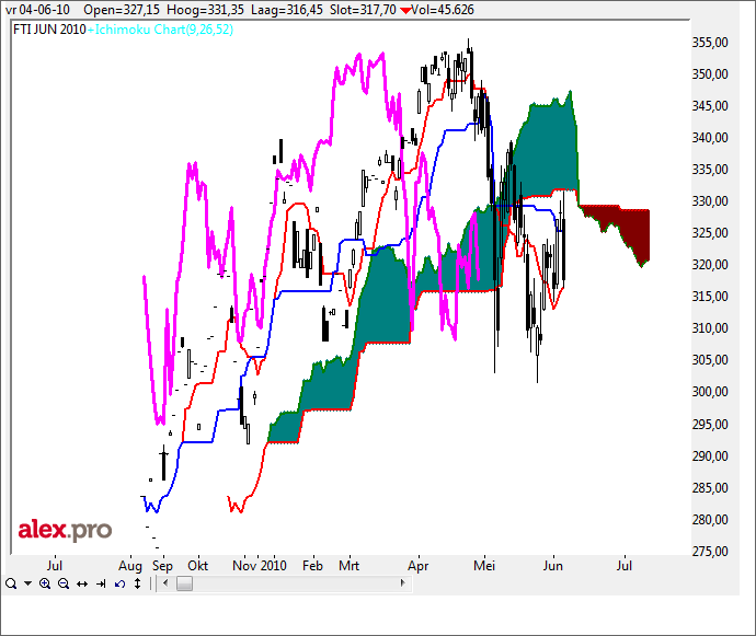 Een slot van de koers boven de wolk, dat lijkt positief, maar let op ... de paarse lagging-line is nog niet boven de wolk uitgebroken.