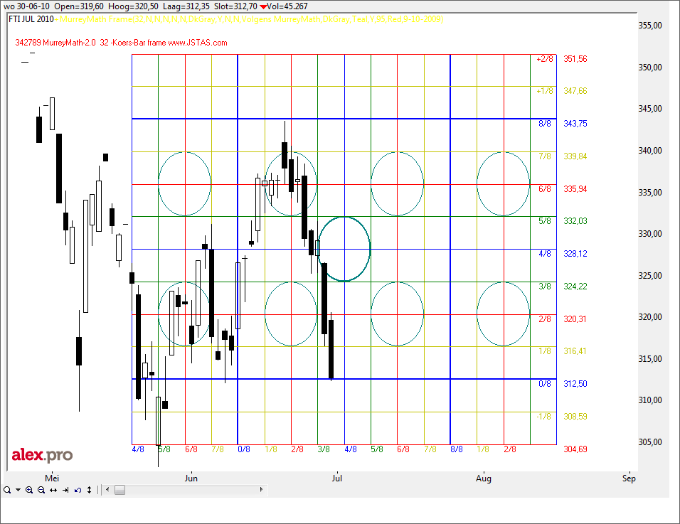 Altijd weer een plaatje die MurreyMath grafiek, en u weet ( ja we weten dat zo langzamerhand wel Jan ) dat die lijnen daar al eeuwen liggen te wachten, maar kijk eens naar de invloed van die lijnen op de koers ... of hoe de koers op die lijnen reageert ...