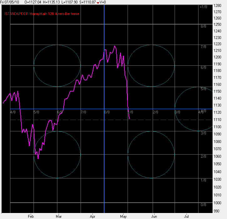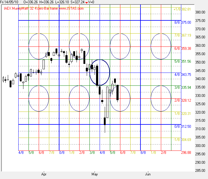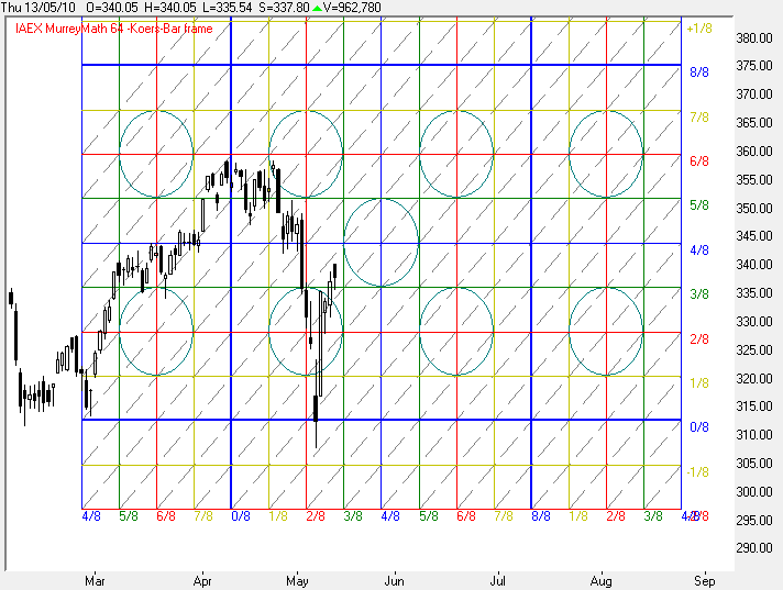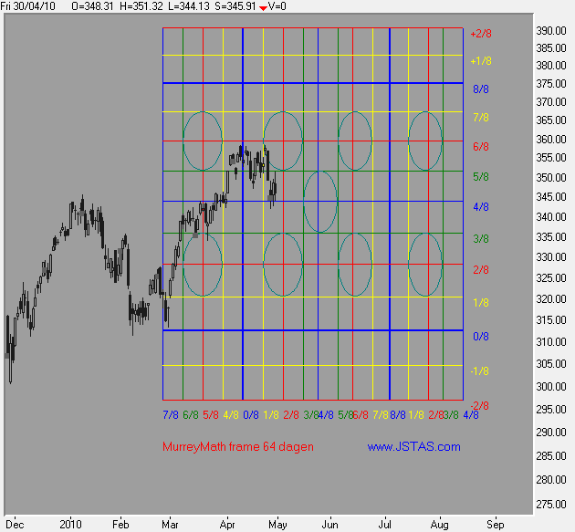 In grafiek 4 ziet u dat de koers vrijdag intraday steun vond op de 360 graden lijn van het Square Of Nine, dat is exact één rondje verder in het SQ9 wanneer u de start legt op de bodem van 13-Juli-2009. | |