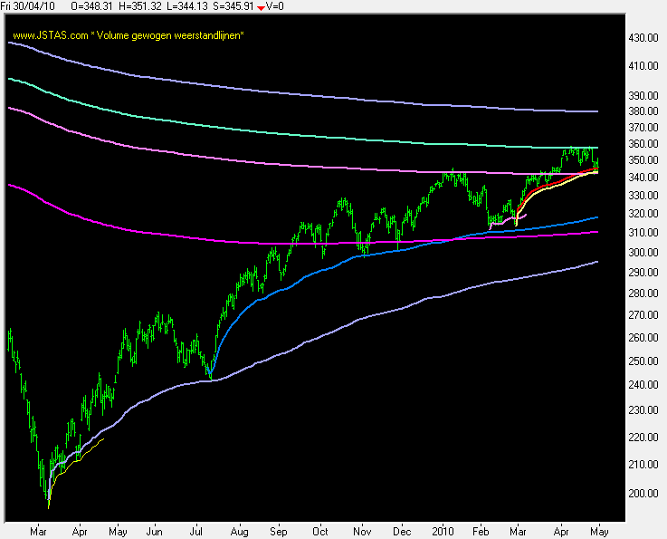 In grafiek 1 ziet u de AEX met de volume -gewogen -steun - weerstandlijnen. | |