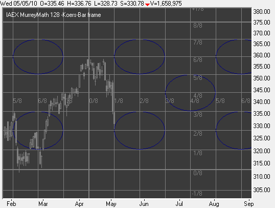 In grafiek 1 zit het hoofdframe tussen de waarde 250-375 (2/8 -3/8 van 1000/8) maar door het inzoomen via de 128 dagen grafiek 2 zie je dat het frame wordt uitvergoot en dat de koers zich bevindt in het 4/8 -8/8 gebied van grafiek 1 dus tussen de waarden 312,50 - 375 | |