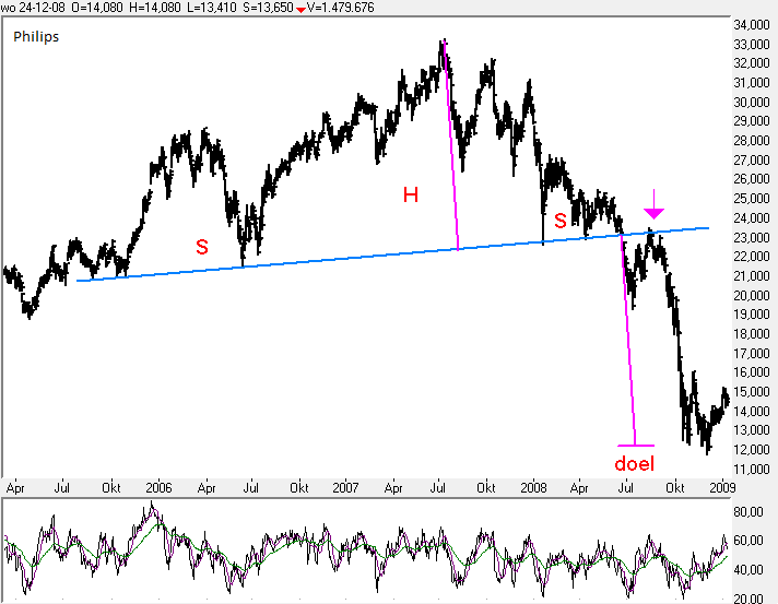 De trend was al duidelijk omlaag op het moment dat de koers en de 'lagging line' door de wolk heen omlaag daalde. | |
