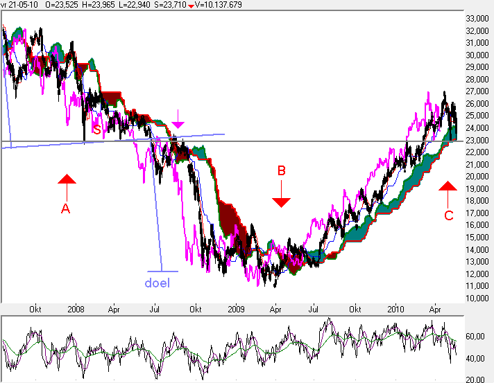 U ziet dat de koers van de AEX index al lange tijd 'opgesloten' zit tussen twee volume -gewogen -steun -weerstand -lijnen volgens het idee van Dr. Levine. | |