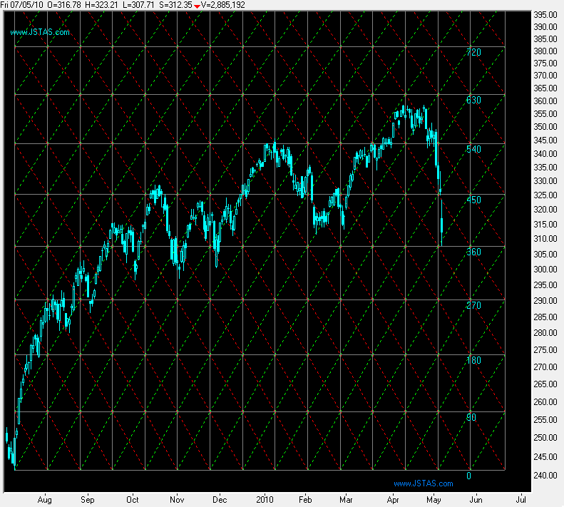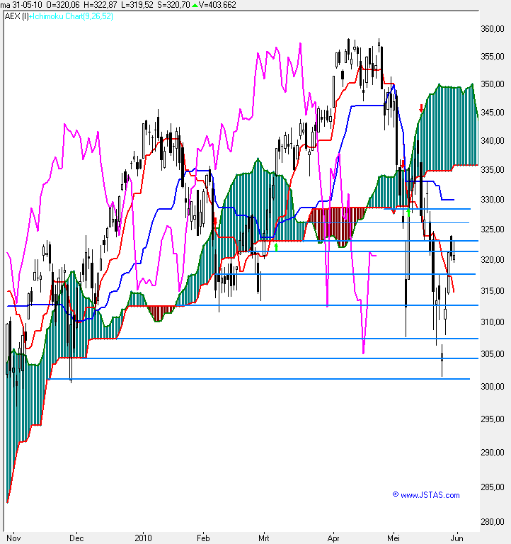 Je had dan waarschijnlijk gekocht toen de koers door de wolk brak, rond 310 en de zeer voorzichtige speculant had gekocht toen de lagging-line door de wolk brak, dat was rondom de koerswaarde 312,2 | |