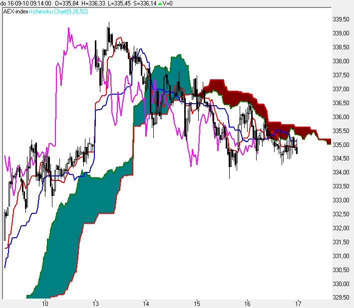 U ziet dat de onderste schaduw van de koerscandle van afgelopen donderdag steun vond op de bovenzijde van de wolk in de Ichimoku Kinko Hyo grafiek.