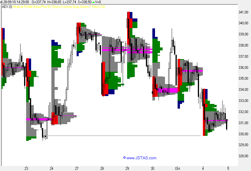 We zien een koersverloop wat de rest van de dag een min of meer zijwaartse beweging maakt, volgens de Market Profile is dat een ‘koers die in balans is’, en vaak wordt dan keurig de Bell curve zichtbaar.