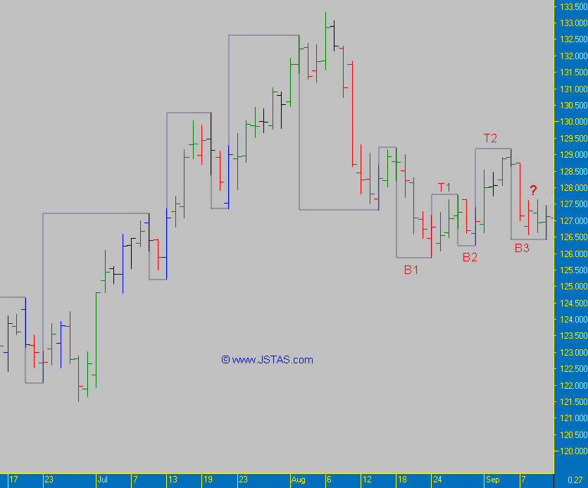 U ziet dat bij bodem -B1 de koers een lagere bodem maakt, de RSI(14) ook; maar de Composite Index doet dit niet en divergeert met de RSI(14) en de koers.