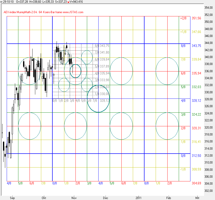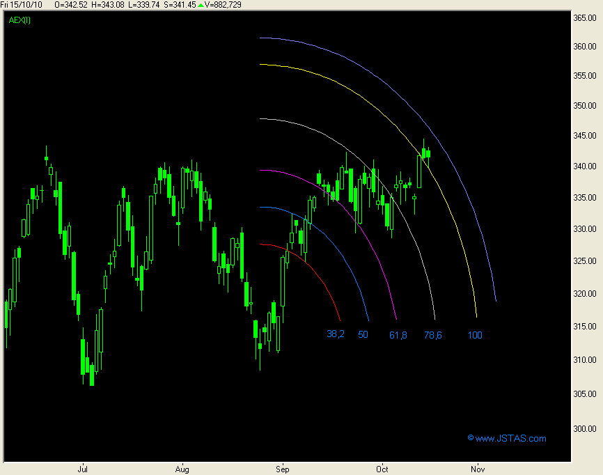 In grafiek 4, de AEX -index is te zien dat de koersdaling afgelopen vrijdag afketste op de 5/8 lijn, de bovenzijde van het trading gebied.