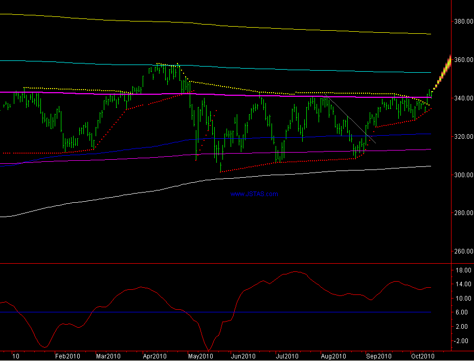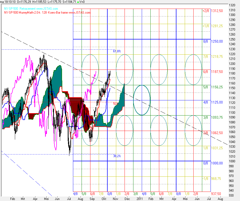 In de Ichimoku Kinko Hyo daggrafiek (grafiek 5 hieronder) zien we dat de koers sterk opveerde vanaf de wolk op Donderdag 23-09-2010.