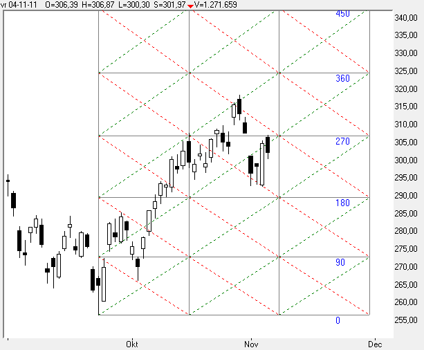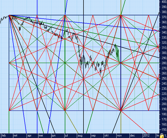 In grafiek 6 het Gann Square op basis van de top op 28-02 en de bodem op 23-09 dit jaar.
