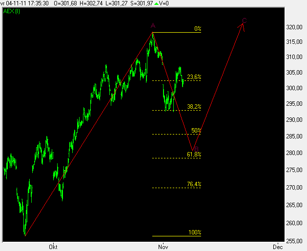 Na de A op 28-10-2011 is de koers dan nu bezig met de B golf, die inmiddels wel knap ver corrigeert voor een zigzag, ik zie een zigzag liever stoppen rondom de 61,8%, mocht de koers nog veel verder gaan, dan zal ik de telling wellicht moeten gaan aanpassen naar een flat.