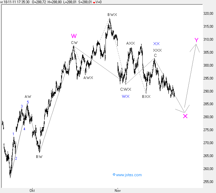 In dat geval is er een impulsgolf omlaag begonnen op 28-10.... op de plaats van de W komt dan een 1 te staan, op de plaats van de X komt dan een 2 te staan, en waar nu de Y staat komt dan 3:3 te staan ... in dit geval is dan de golf omlaag nog niet gereed, en is de stijging van afgelopen Vrijdag onderdeel van golf 4:3 waarna dan weer 5:3 omlaag volgt voordat deze golf gereed is.