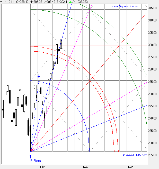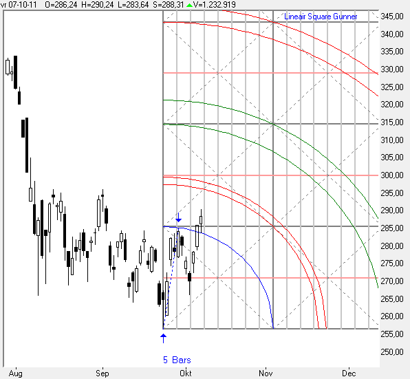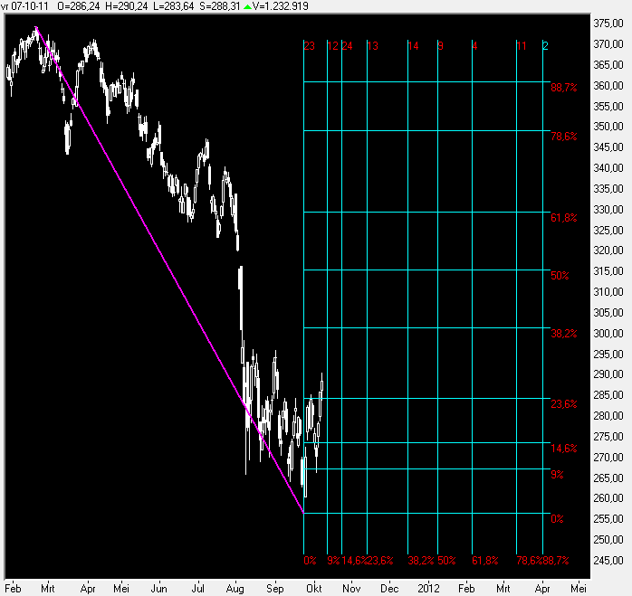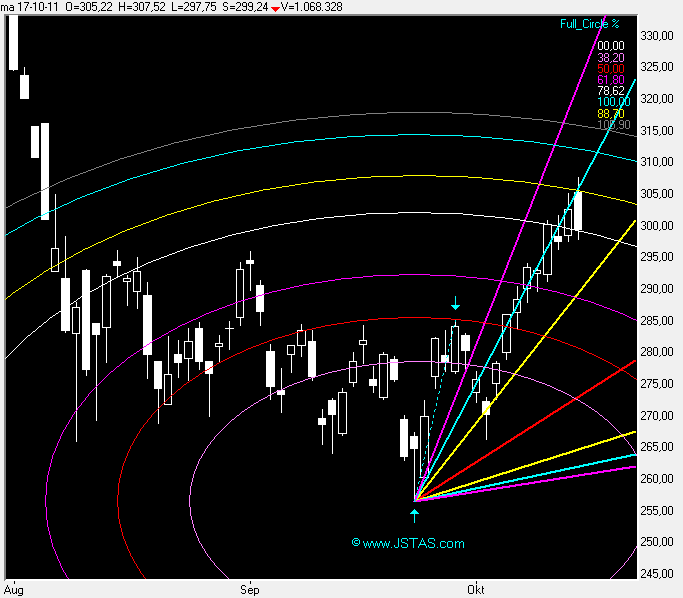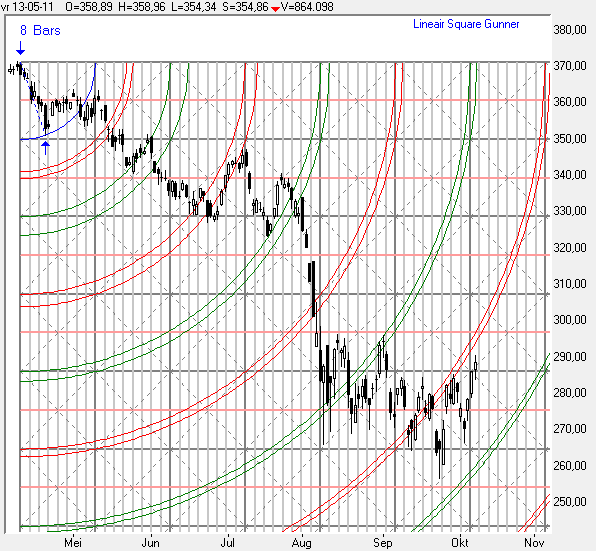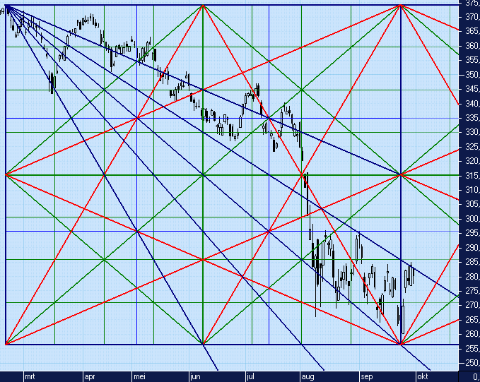 In grafiek 5 ziet u even een Gann-Square uitgezet vanaf de top in 18-Februari tot de bodem op 23-September dit jaar.