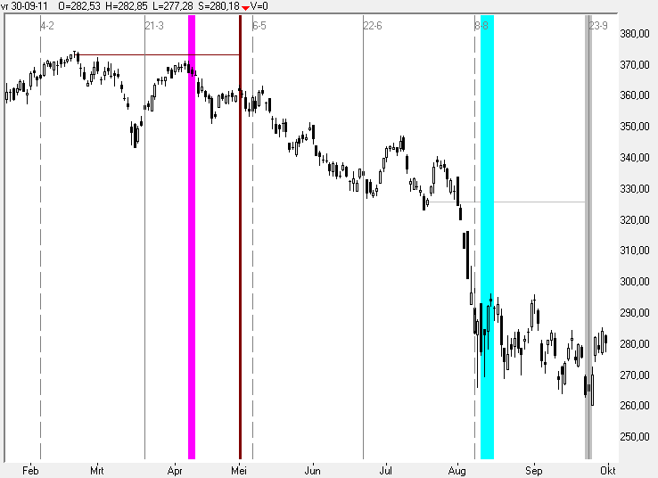 De lichtgrijze band heeft als oorsprong het dalletje van 18-07-2011, en valt heel mooi samen met de seasonal-date van 23-09 en het dal in de koers op dat moment.