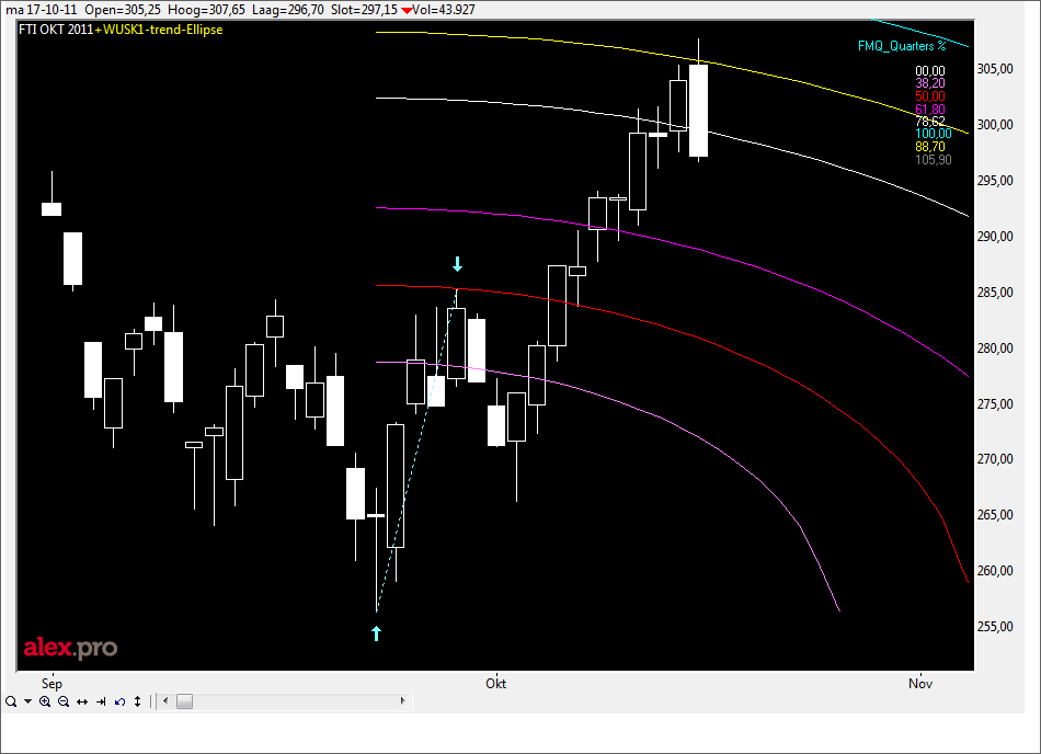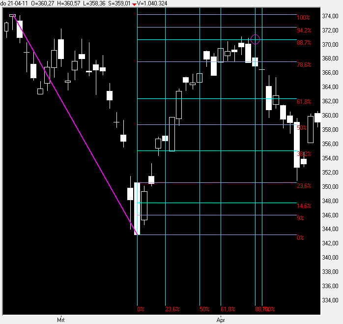 Onzin natuurlijk, maar toch leuk om te zien hoe de koers vandaag zijn uitersten vond op de blauwe 100% lijn en de gele 88,7% lijn in combinatie met de 2X1 gele Gannlijn.