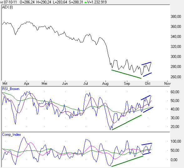 In grafiek ziet u de AEX grafiek met daaronder weergegeven de RSI(14) en de Composite-index van Mevrouw Brown.