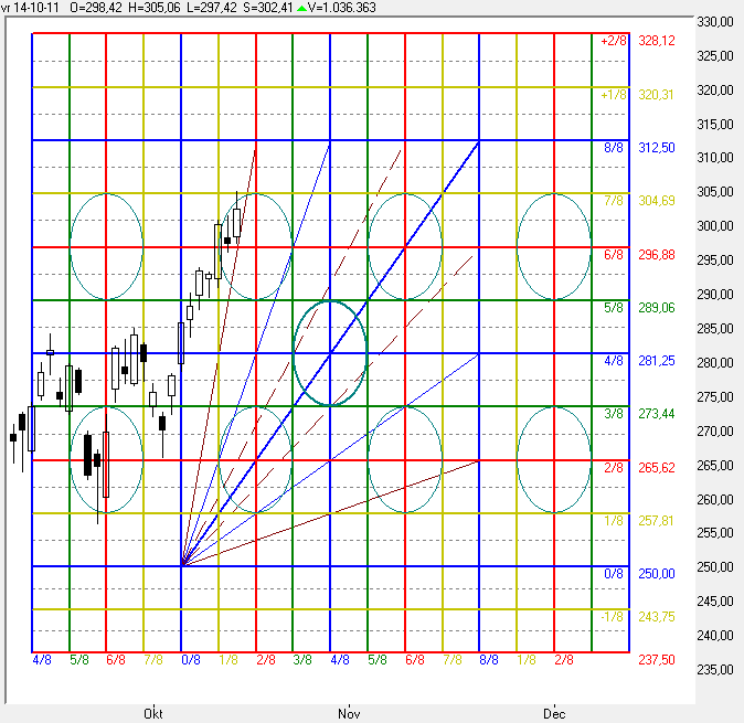 U ziet hier een full-square van Gann afgebeeld, gebaseerd op de top van 18-Februari en het dalletje van 23-September dit jaar.
