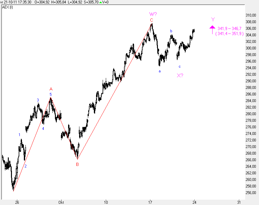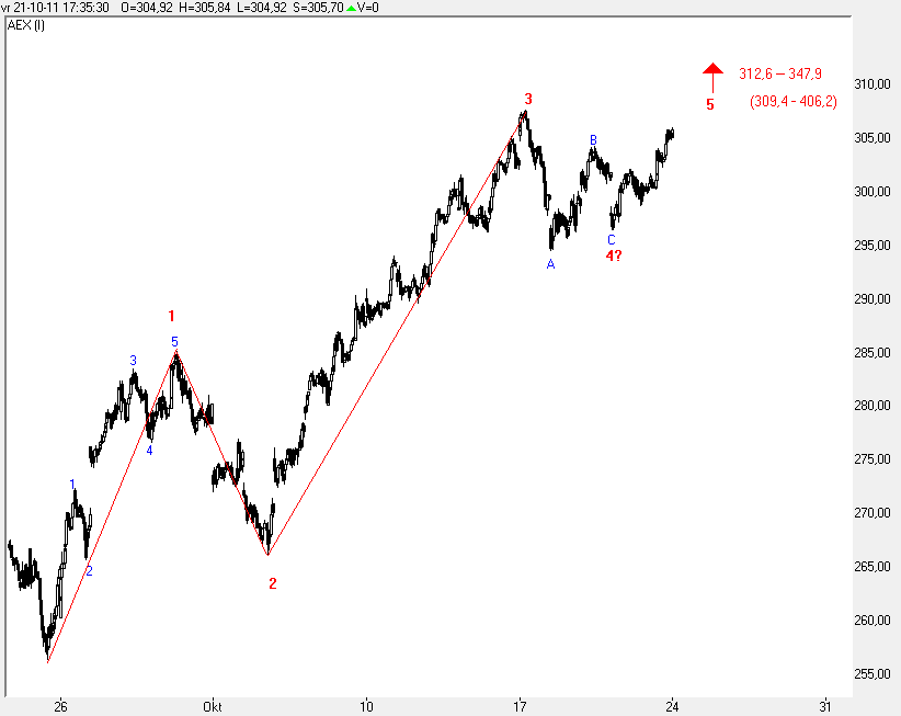 Dit pleit er in principe voor, dat op 23-09 een complete impulsgolf geplaatst is, daarmee zou grafiek 10 dan de voorkeur krijgen boven grafiek 11, en gaan we komende week eerst even omlaag als reactie op de stijging vanaf 23-09, voordat we daarna verder omhoog gaan.