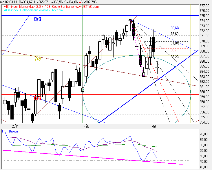 U ziet de AEX grafiek met daarin Het MurreyMath frame op basis van 128 dagen, met daarin de mini-MurreyMath lines en de speedlines-up .