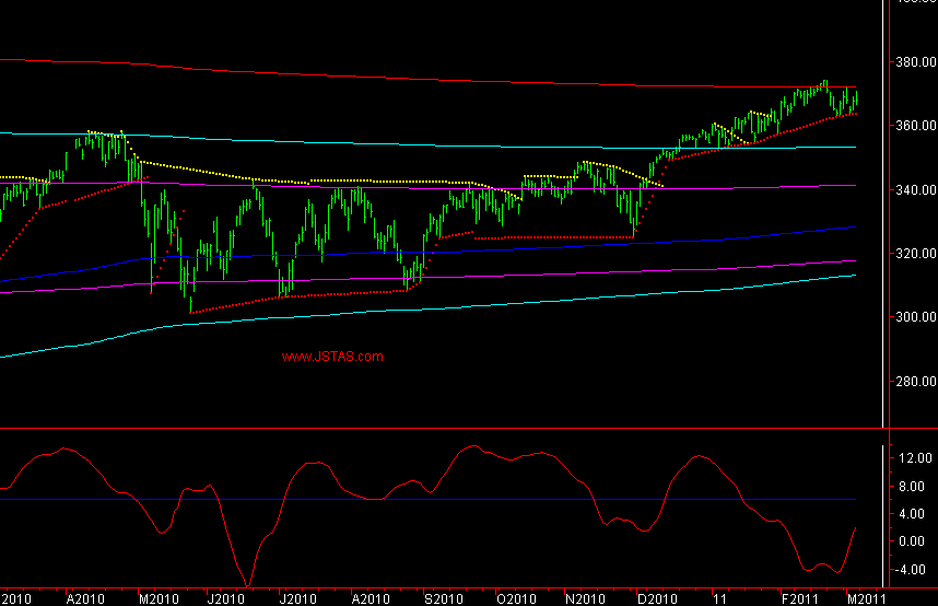 De situatie in deze maand grafiek lijkt nog steeds erg op die van begin 2005 zoals ik enige tijd geleden al aanhaalde; voor een verder gelijk verloop zou de koers niet door de groene 50% lijn in het square mogen dalen.