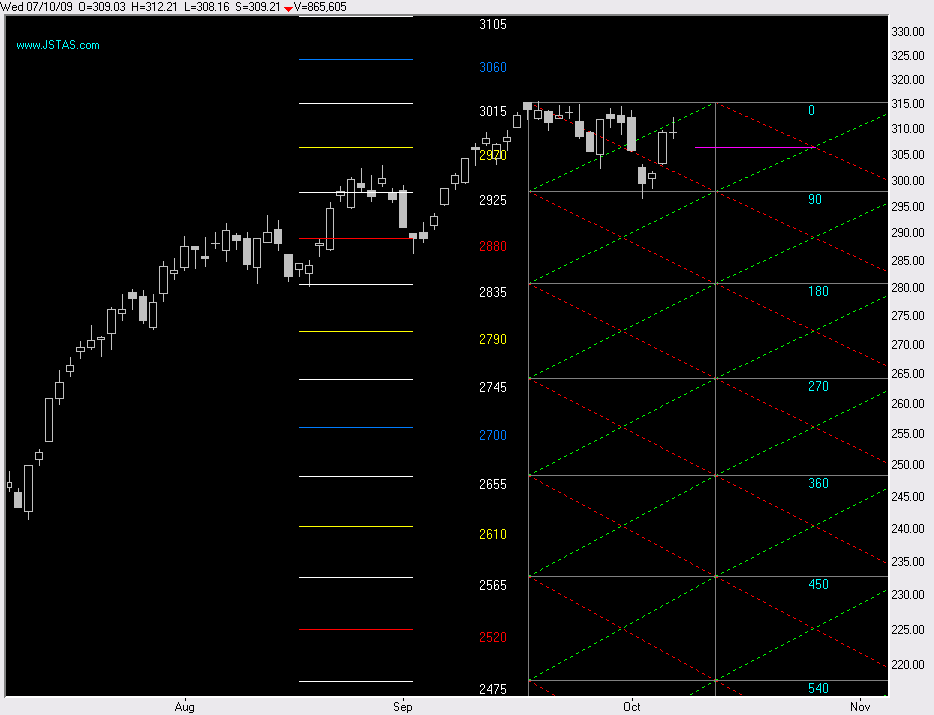 Ik had na het afketsen op de 90-graden lijn = 2925 graden lijn een opwaartse golfbeweging verwacht naar het paarse horizontale lijntje, een 50% gebied in het square waarna verdere daling; dit in samenhang met een 4-tje waarna een 5-je verder omlaag.